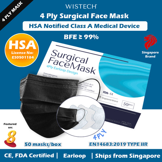 [Individually Sealed] Black Wistech 3 Ply Surgical Face Mask, 50 pieces