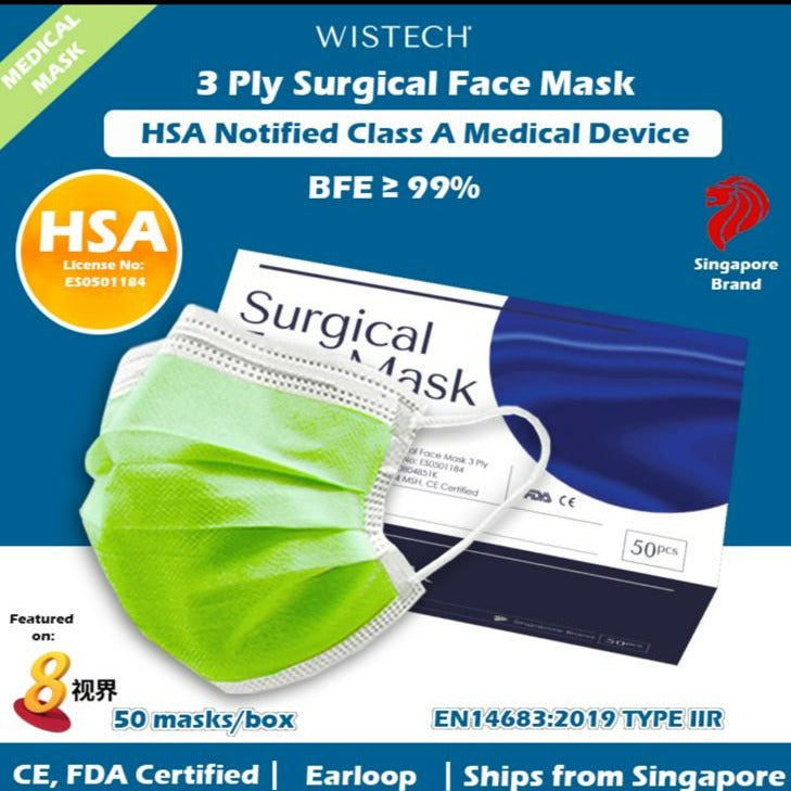 Wistech Adult Surgical Green Face Mask is Singapore branded FDA and CE certified disposable medical mask in Singapore and Malaysia. Made with comfortable and breathable materials, it is flexible, foldable, waterproof and adjustable with ear loop for everyday use. The 3 layers of protection is made from a combination of fabric and polypropylene.