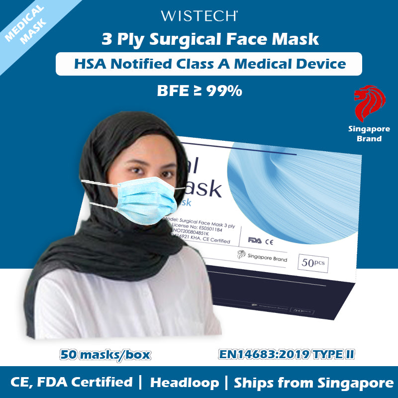 Wistech Adult Headloop 3-Ply Surgical Face Mask is Singapore branded FDA and CE certified disposable medical mask in Singapore and Malaysia. Made with comfortable and breathable materials, it is flexible, foldable, waterproof and adjustable with ear loop for everyday use. The 3 layers of protection, FFP2 and FFP3 is made from a combination of fabric and polypropylene.